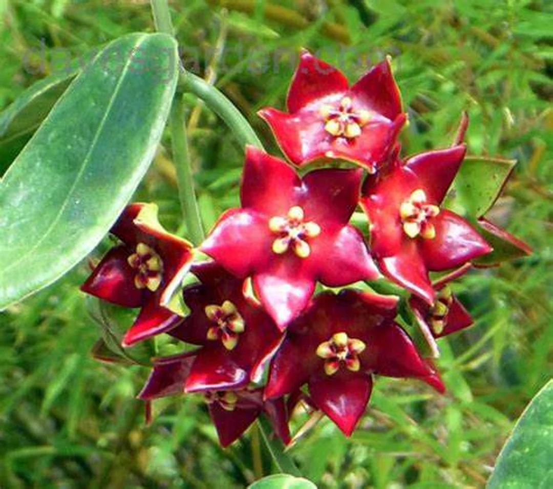 • Fleurs : Très grandes étoiles cireuses, rouge foncé à pourpre, parfois avec des reflets presque noirs. Ombelles peu nombreuses mais très décoratives. Parfum sucré et puissant.