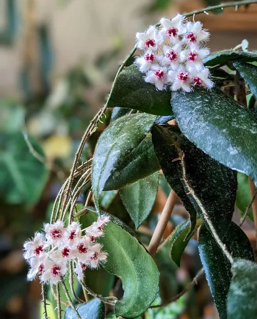 • Fleurs : Petites étoiles cireuses, blanches à crème avec un cœur rouge foncé, regroupées en ombelles. Parfum épicé, parfois fort et musqué.
